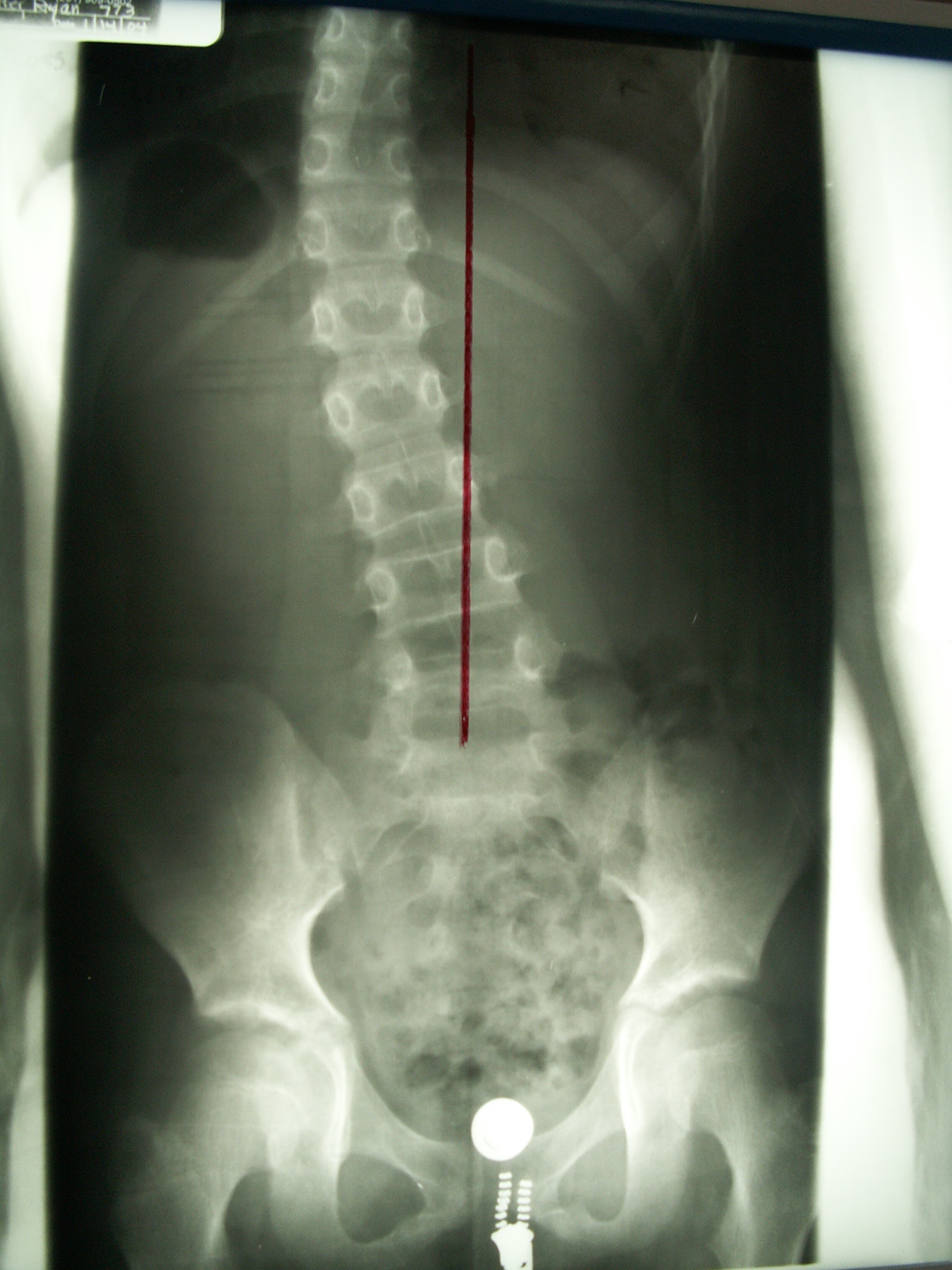 Plumb line – A plumb line is “dropped” from the C7 vertebra (in the neck) and is allowed to hang below the buttocks. In scoliosis the line does not hang between the buttocks.