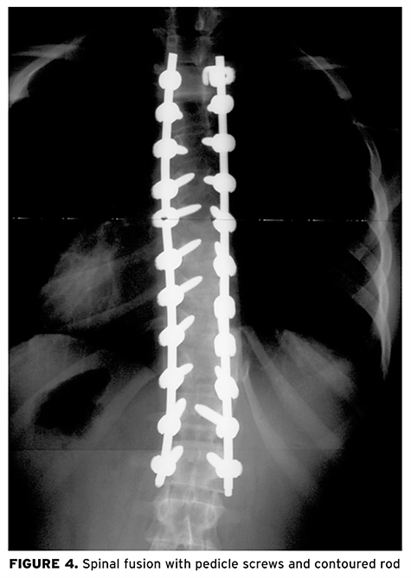 Large curves (those between 20-40 degrees) will require bracing to prevent further progression of the curve. If vital organs are compromised, surgery is even possible, but usually not until angles of 45 degrees or greater are found. (Below is an x-ray of a surgical correction using contoured Harrington rods and pedicle screws.)