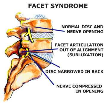 A little anatomy: The vertebral bodies are stacked one on top of another to form the entire structure of the spine. On each side of the vertebral bodies are tiny joints called facet joints. Facet Joint Syndrome is a condition in which joint jamming and inflammation occur, and the nerves to the facet joints convey severe and diffuse pain. Often there is some resulting ‘wear and tear’ that’s also been suffered at the involved levels.