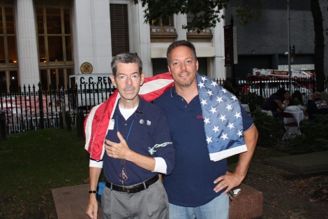 Walking thru the Chapel’s gates and up the stairs on September 10, 2011 happened in slow motion for me. I felt as if I was visiting myself…the part of me that I left there over 9 years ago. There was a familiarity, but in structures only. What I’d remembered seeing and what was there now flashed back and forth thru my mind, past to present and back again – similar to the time sequences in the movie “Titanic”. I saw Davy there. He was asked to do a reading for the 2:30 service. After it ended, we went outside to the “volunteers barbeque” in the cemetery area. We stayed and talked, meeting up with others we knew and had seen there years before. We seemlessly talked for hours, shared stories and an occasional tear, and before we knew it they were closing up. A man (name intentionally withheld) in a Search and Rescue uniform from Maryland approached us. He read my blue collared “St Paul’s Ground Zero Volunteer” shirt and asked, “So, you volunteered here?” Davy was engaged in a conversation with another LMT, so I replied “Yes, we worked in the Chapel for 9- and 8- months, respectively.” He smiled and said, “Thank you for your service here. You’re both worthy..!” He reached into his dufflebag and pulled out a roughed-up and sun-bleached American flag, folded in the familiar triangular shape typically reserved for presentation to military families. He then unraveled it and slung it over my neck like an aerobics instructor would do with a gym towel. He caught my eye said, “I raised this flag on the top of Osama Bin Laden’s home after we killed him in May, and I feel it’s important for you to share in that.”