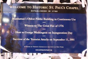 Previously I’d not found a place or thing that gives me the feeling St. Paul’s Chapel does, but it has never failed to deliver something…an awareness, an enlightenment or even a richness of comfort and emotion. However, this time, it delivered something and someone: a symbol of gratitude, accomplishment and recognition. A simple gesture that said “Thank You and Farewell” in the form of a veteran and a very special American flag.